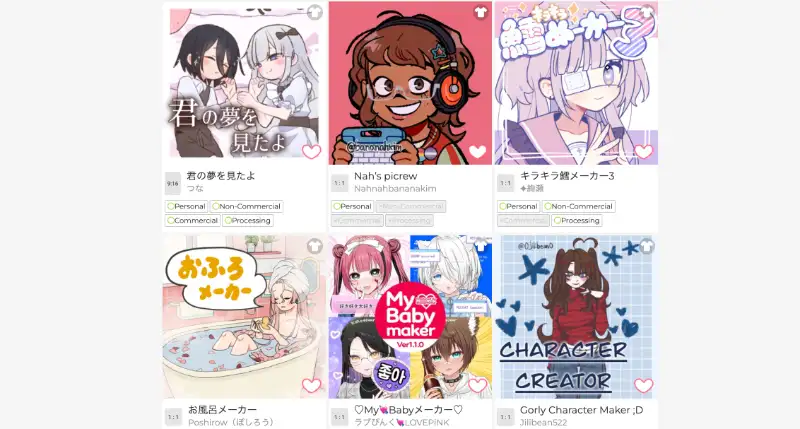 Picrew is an innovative image maker platform that lets users design their own custom avatars with a playful and interactive experience. Artists can upload their own creators and define the scope of permissions, choosing from Personal, Non-Commercial, Commercial, and Processing usage. A bookmark function lets you save and revisit your preferred image makers.